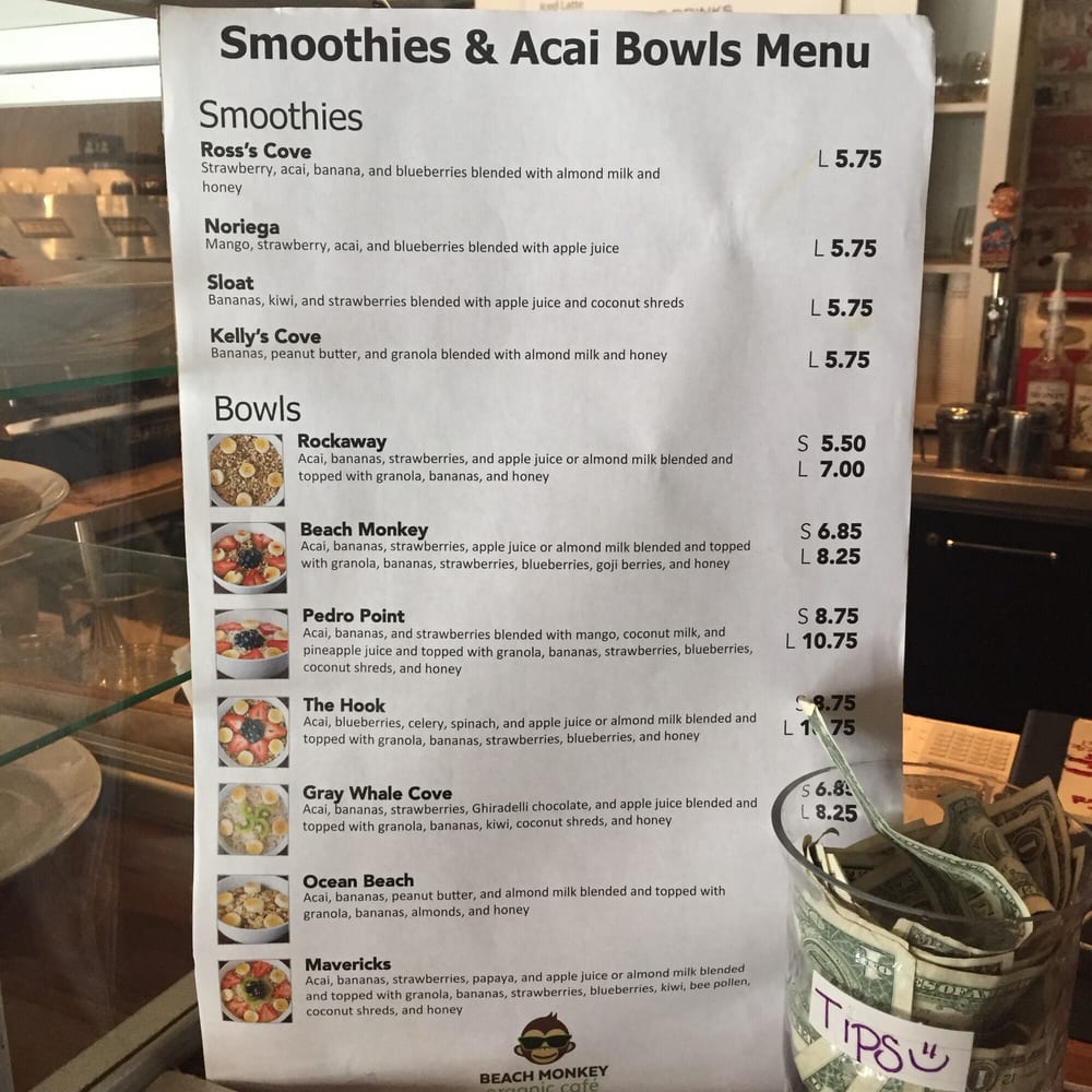 Welcome to Beach Monkey Organic Cafe, a hidden gem nestled in the Adobe Plaza Shopping Center in Pacifica, California. Specializing in breakfast and brunch, this charming cafe offers a delightful menu focused on healthy, organic dishes. The standout items are their Acai Bowls, like the Beach Monkey Bowl and Pedro Point Bowl, exquisitely crafted with fresh organic fruits, gluten-free housemade granola, and a choice of juices. For smoothie enthusiasts, options like the Ross's Cove and Go Green Smoothies provide refreshing, nutrient-packed blends that invigorate your day.